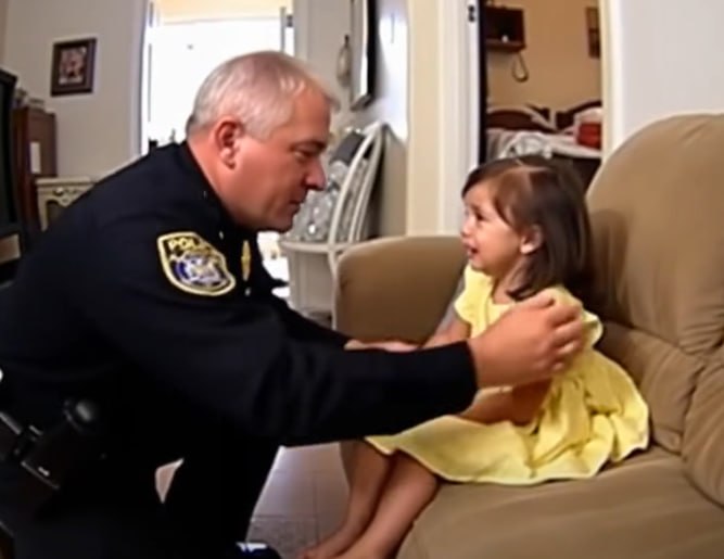 He reassured her, explaining that she had acted bravely by calling for help. The child remained silent, visibly overwhelmed by everything happening around her.