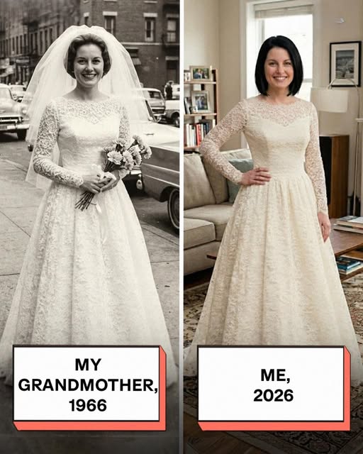 The promise began on a quiet evening beneath the glow of a porch light. Her grandmother, Rose, carefully lifted a wedding dress from an old garment bag and held it up.