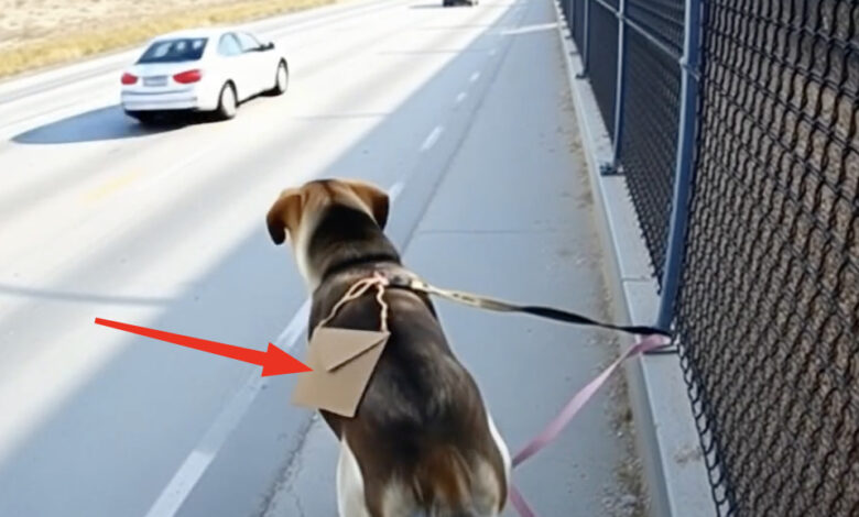 On a deserted highway, a dog was tied to a fence, and around its neck