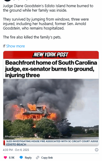 Just over a month after issuing a high-profile ruling on voter data privacy, South Carolina Circuit Court Judge Diane Goodstein faced an unexpected personal crisis: a massive fire that consumed her family’s marshfront home in Edisto Beach. The three-story residence, located at 18 Planters Retreat in the gated Jeremy Cay…